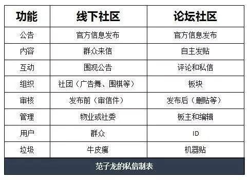 上面这段有点难懂,我做了张表,我们来对比下线下社区和论坛的功能: