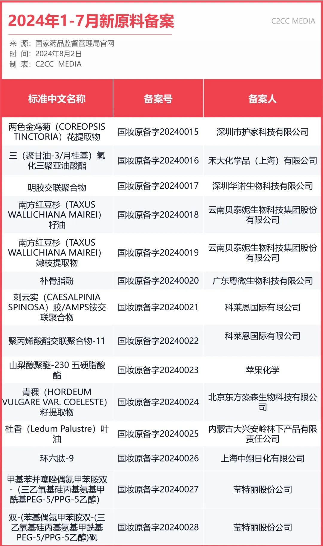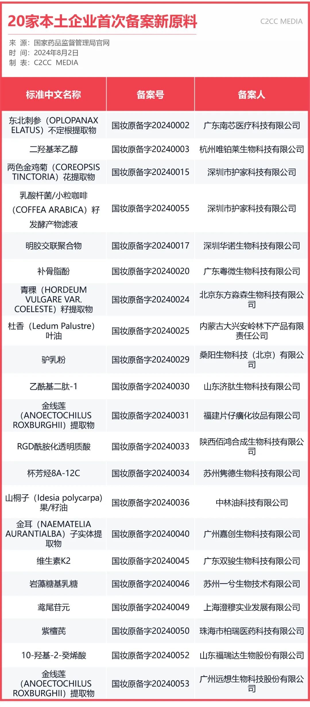 C2CC传媒X新妆梳理发现,今年有20家本土企业首次备案新原料。