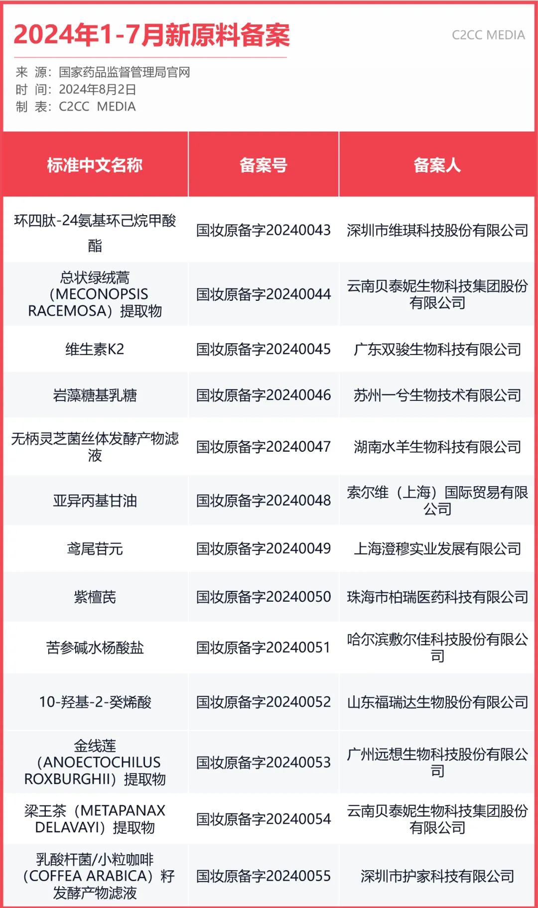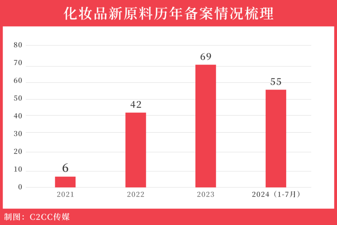 根据C2CC传媒X新妆统计,2024年1-7月,国家药监局官网共计55个新原料完成备案,而2023年、2022年、2021年分别备案69、42、6。换言之,今年前7个月就达到了去年全年80%的备案数量。
