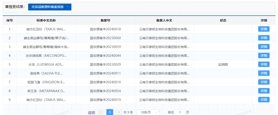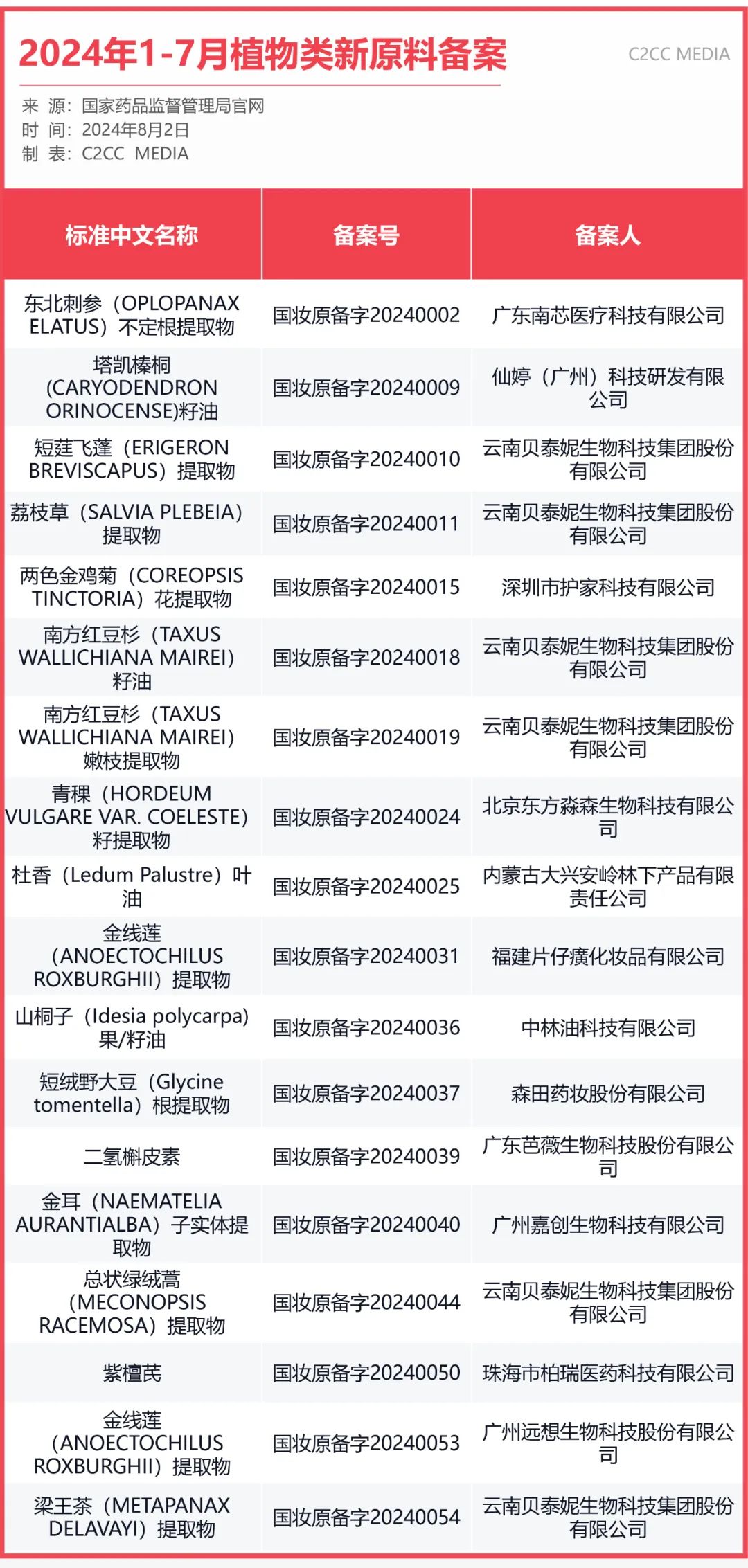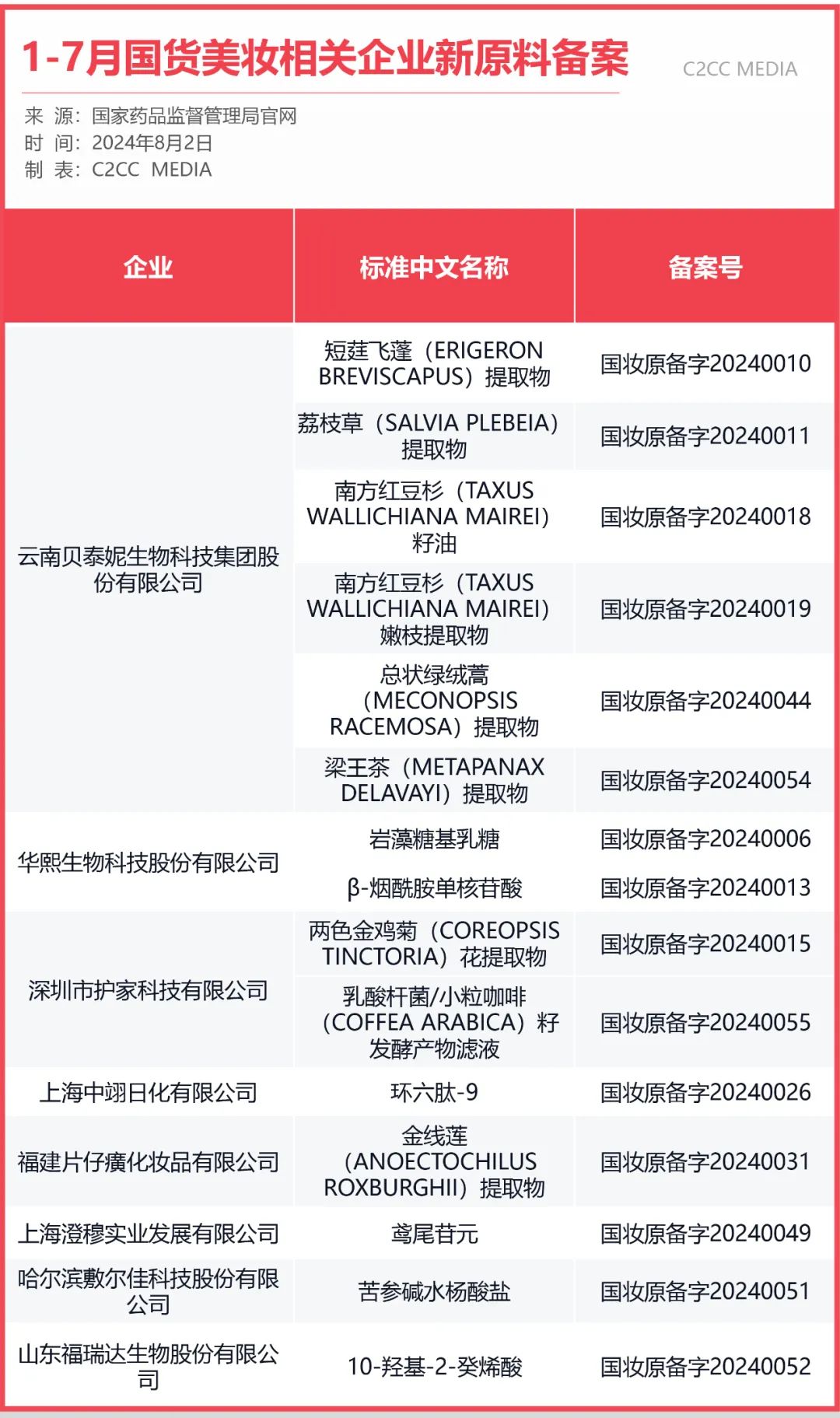 其中,云南贝泰妮生物科技集团股份有限公司备案6个,分别为短莛飞蓬提取物、荔枝草提取物、南方红豆杉籽油、南方红豆杉嫩枝提取物、总状绿绒蒿提取物、梁王茶提取物。