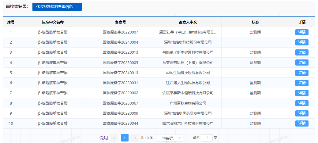 随着越来越多的化妆品企业将NMN作为新原料备案,NMN也成为了最热门的跨界原料。不过,NMN虽已在国外应用于化妆品中,但因为在临床研究层面,更多是口服方式,涂抹于皮肤的研究并不多。所以,NMN在国内仅作为一般普通化妆品原料备案,而不作为功效原料。目前,该原料尚处于3年检测期。