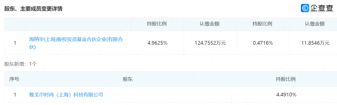 另据企查查公开信息披露,雅戈尔时尚以112万元的认缴出资额获得了林清轩公司4.491%的股份。与此同时,林清轩公司A轮投资方海纳华(上海)股权投资基金合伙企业(有限合伙)(下称“海纳华”)的持股比例则减少了4.491%,认缴出资额也由此前的125万元变更为11.85万元。