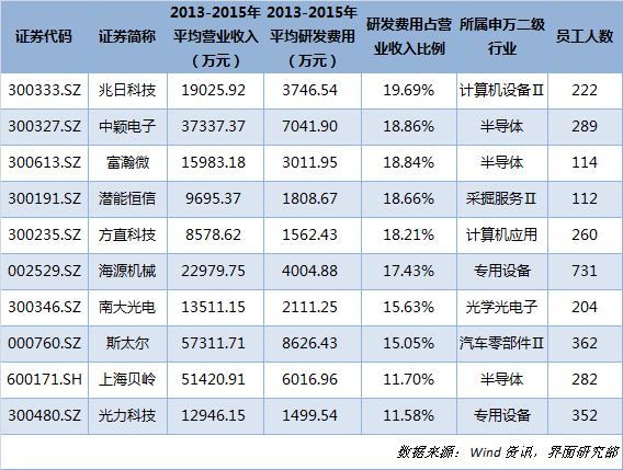 界面新闻选择目前较为广泛使用的标准(工业企业为从业人员1000人以下或营业收入40000万元以下,农业企业为营业收入20000元以下,服务业及其他企业为从业人员300人以下或营业收入10000元以下),根据2013-2015年年报披露的营业收入与研发费用指标,对A股上市公司进行了梳理,研发费用占营业收入比例排名前10位公司的具体情况如下表所示: