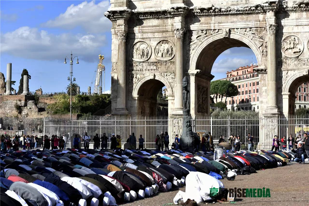 意大利首都罗马穆斯林在祷告,穆斯林的迅速扩张也给该国右翼五星运动党兴起创造了土壤。