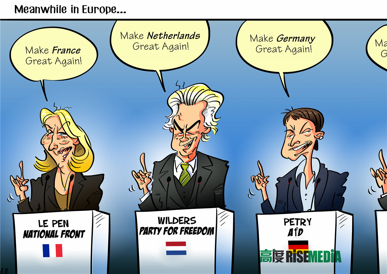 更值得警觉的是,今年1月下旬在德国库布仑兹(Koblenz)召开了民族主义者大会,法国勒庞、荷兰威尔德斯和德国佩特勒等相聚甚欢,欧洲极右力量大有合流态势,场内蓝光四射,充溢着必胜气氛,为二战结束以来罕见。他们聚会的时机选择耐人寻味,为大选制造舆论声势,也展示“泛民族主义运动”的团结阵势。他们在向川普致敬的同时,也提出与川普类似的口号:“让我们的国家再次伟大”!正是在这次会上,勒庞发布了“欧洲复兴”提法,以维护白人的纯正性,抵御穆斯林难民的侵蚀。威尔德斯在会上提出:从昨天的美国,到今天的库布仑兹,再到明天的新欧洲,标志着整个欧洲的觉醒。