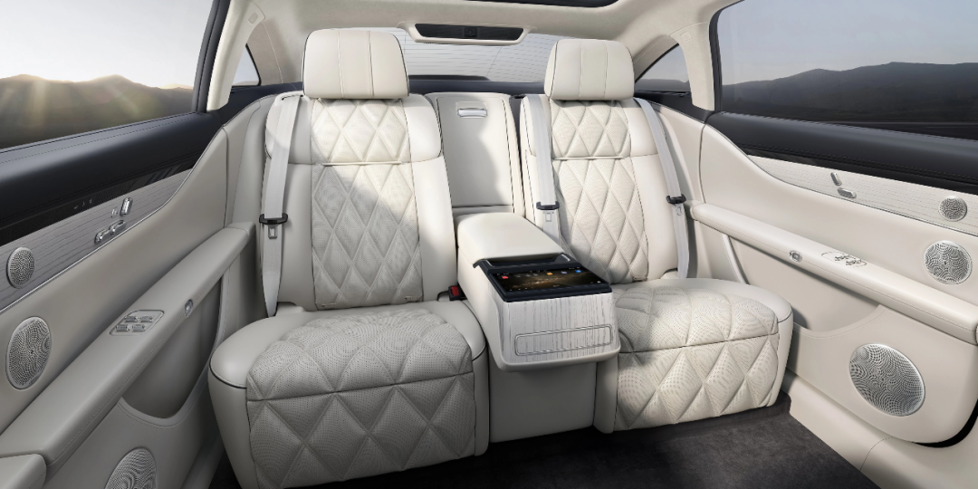 如老板位采用零重力座椅;扶手前设置了一块9英寸的可触摸屏幕,可控制影音娱乐、调节座椅;扶手后设置了既能制冷也能制热的冷暖箱;还搭载了后排隐私声盾功能等等。