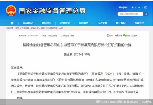 今年2月,同样来自齐鲁银行的韩松,任职莱商银行副行长资格,得到监管核准。韩松分管莱商银行的风险管理部、授信审批部、资产保全部、法律合规部等多个部门。