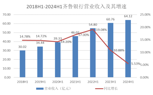 齐鲁银行业绩快报显示,其2024年上半年的营收增速,较上年同期腰斩。如果再往前追溯,这是该行自2018年以来,半年度收入增速首次下滑到个位数。