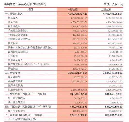 根据年度报告,2023年该行实现营业收入43.59亿元,同比增长4.58%;净利润5.72亿元,同比减少23.18%;经营活动产生的现金流量净额为-10.55亿元,同比由正转负。