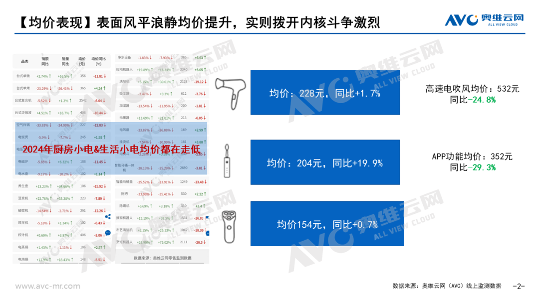 受制于今年整体消费环境的低迷,我们可以看到整体小家电市场大多品类都是呈现价格下探趋势,对应个护小家电来说,价格战表现也是十分激烈。表面来看三品类均价都有一定上涨,主要得益于产品结构调整,高速电吹风以及智能化电动牙刷的持续渗透,对应荆轮效应,人的消费习惯形成之后有不可逆性,一旦习惯养成,便再难回归传统产品,且个护小家电产品单价较低,比较容易去做产品升级。对应细分类目来看,高速电吹风均价同比降低24.8%,电动牙刷APP功能均价同比降低29.3%,激烈程度可见一般。