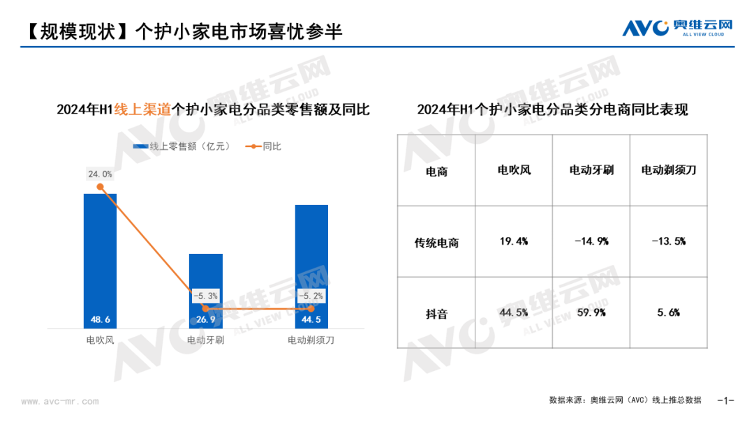 2024年进程过半,回顾个护小家电行业,总结来说喜忧参半。奥维云网(AVC)线上推总数据显示,2024年上半年电吹风零售额48.6亿元,同比增长24.0%,这主要得益于高速电吹风持续渗透,产品升级换新需求增加;电动牙刷零售额26.9亿元,同比降低5.3%,传统电商表现不佳,抖音渠道仍有一定的增长空间。电动剃须刀零售额44.5亿元,同比降低5.2%, 主要原因在于便携式及新兴电商的疲弱,抑制了行业规模增长。