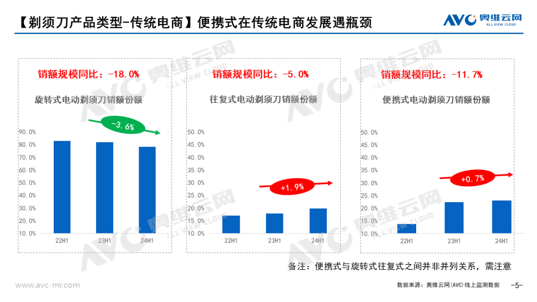 电动剃须刀发展多年,市场相对成熟,渗透率高,主要增长点在于产品换新。去年便携式以及抖音渠道的快速增长拉动了一波消费,如今在二者规模均趋于饱和、增长乏力的状态下,规模有所下滑,零售额同比降低了5.2%。对于产品趋势,有三个方向: