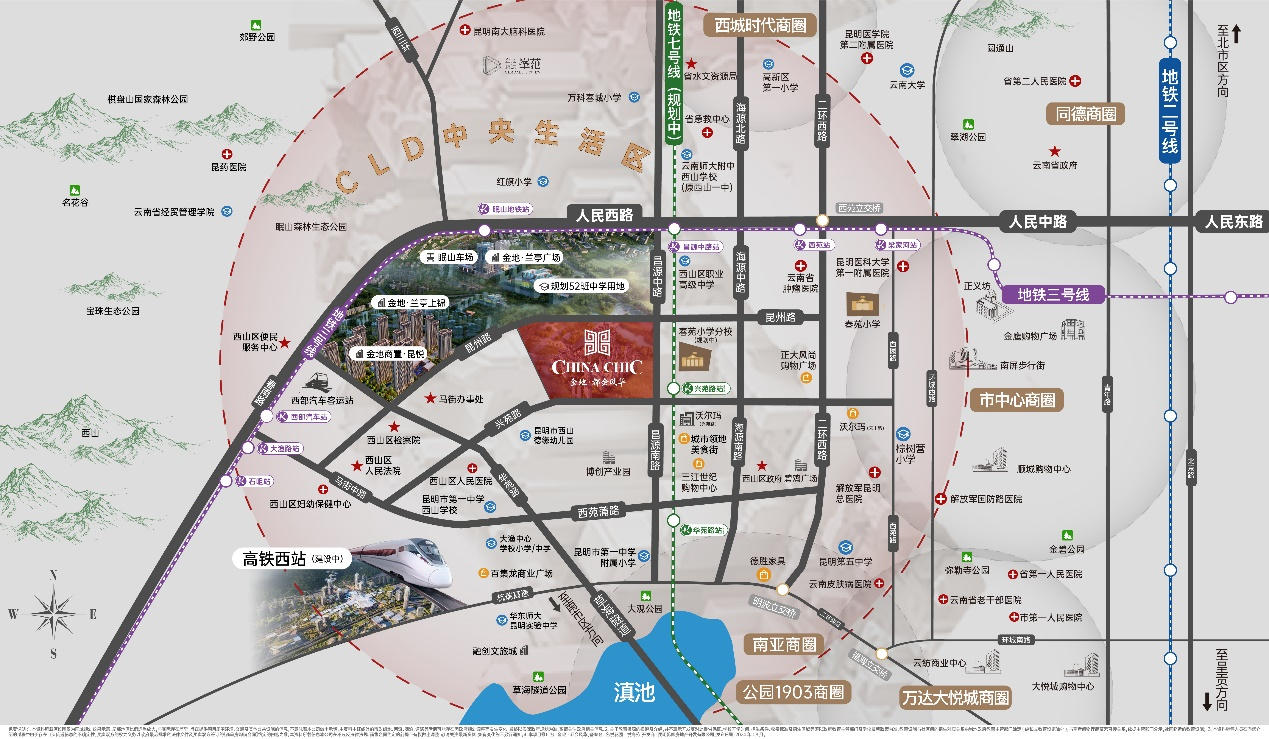 从整体区位上来看,项目刚好位于昆明西客站TOD和市中心商圈两个TOP级城市资源圈的交叉点,处于两者正中间的位置,到两边的距离相当,能够同时享受双边城市资源的辐射。