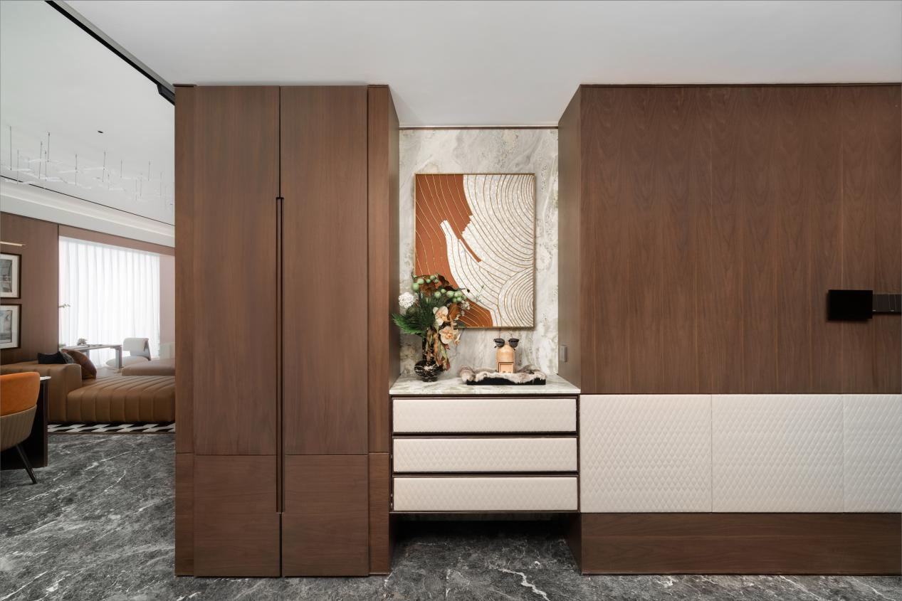 在玄关设计上,巧妙利用2米*60厘米的深度,打造出实用而美观的储物空间,如果对储物有更大空间需求的话,旁边还能放置一个双开门暗藏冰箱。