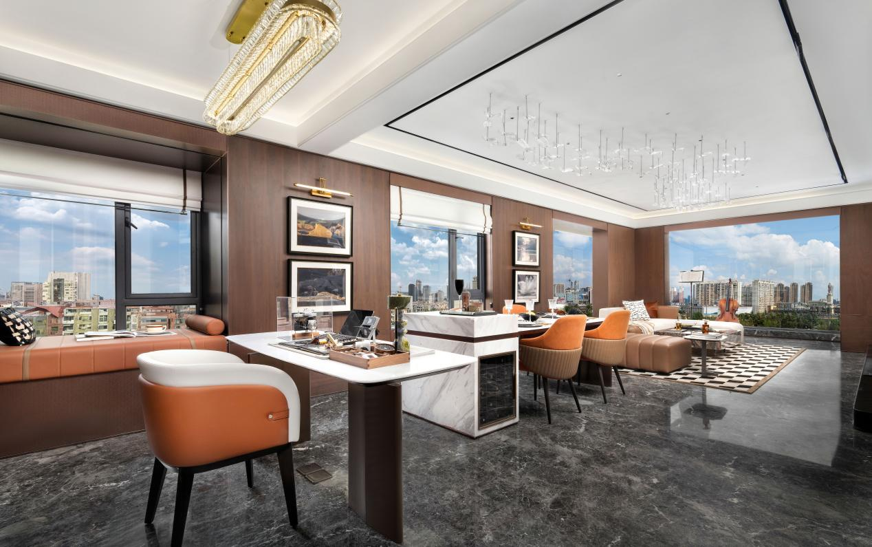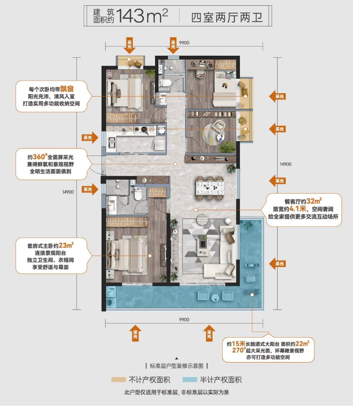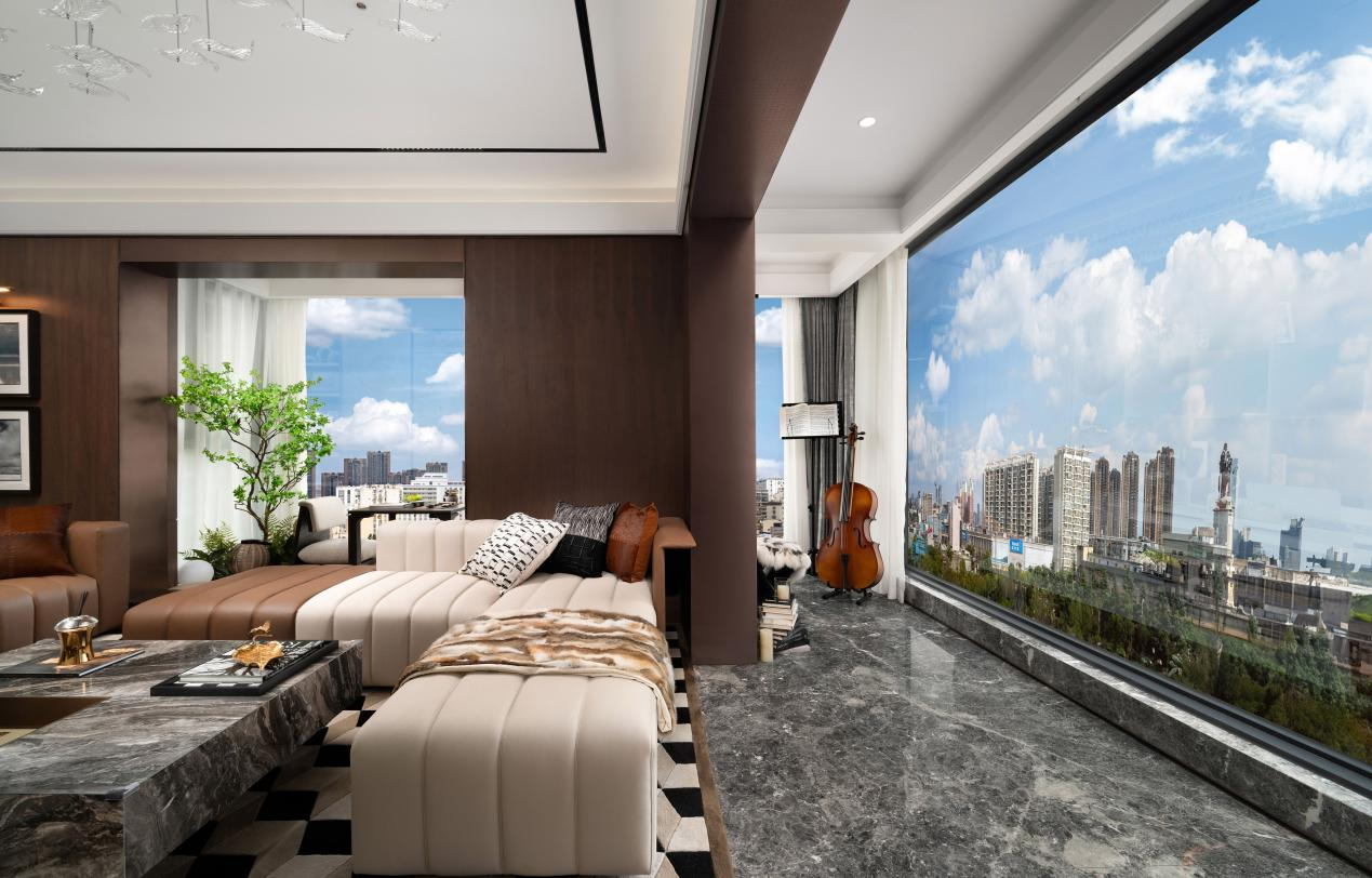 可以说,143㎡户型的阔绰会客厅、L型270度环幕转角景观大阳台、三段式套房主卧、四面360度采光等,空间、视野、尺度可媲美市面上170㎡的户型,均达到了豪宅该有的配置。