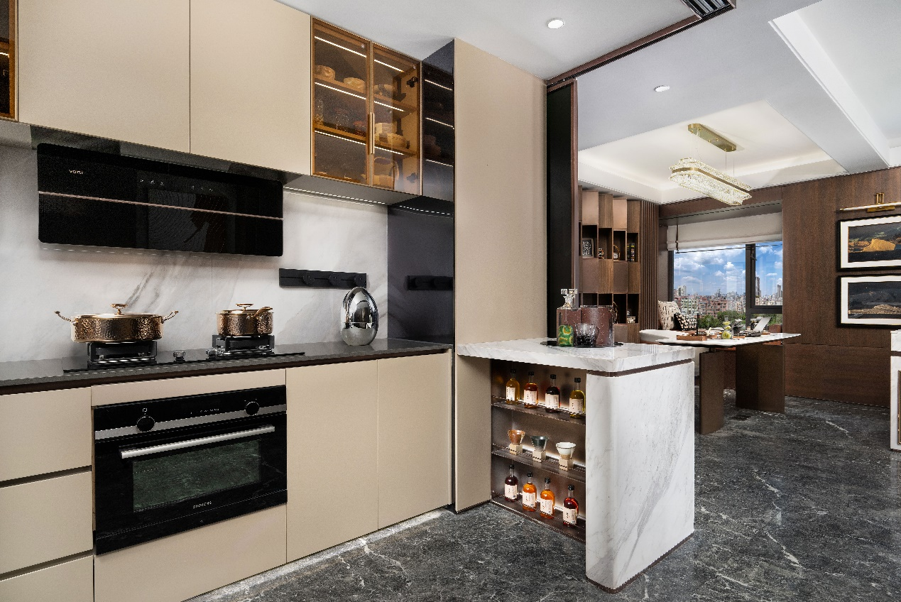 还可以将餐厅改造成半开放式“中西双厨”,既能让厨房操作空间进一步拓展,又能实现与餐厅、书房等公区的流畅交互。