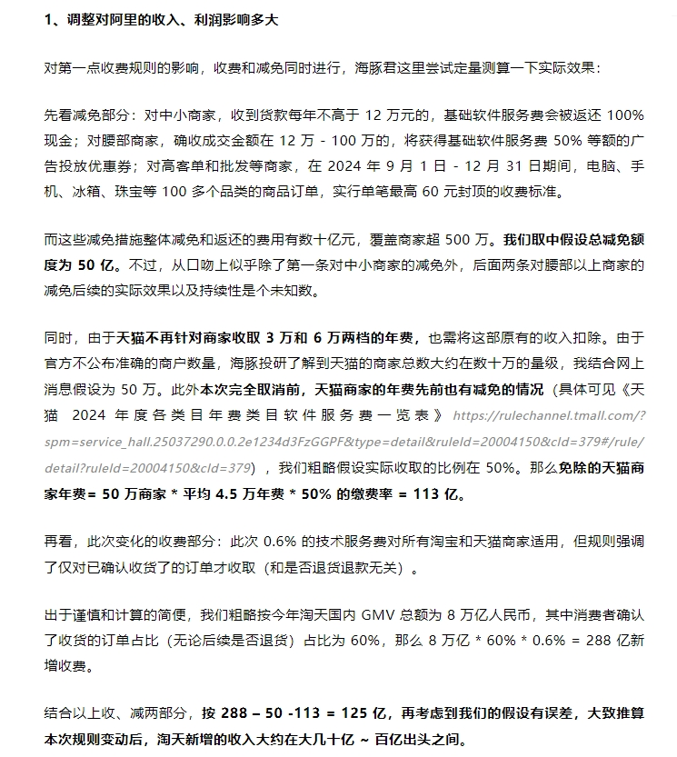 而基础软件服务费的收取,“海豚投研”估算或将给淘天带来每年288 亿元的新增收费。再扣除减免和返还的年费等,估算下来淘天每年新增的收入可能仍在几十亿元到上百亿元之间。