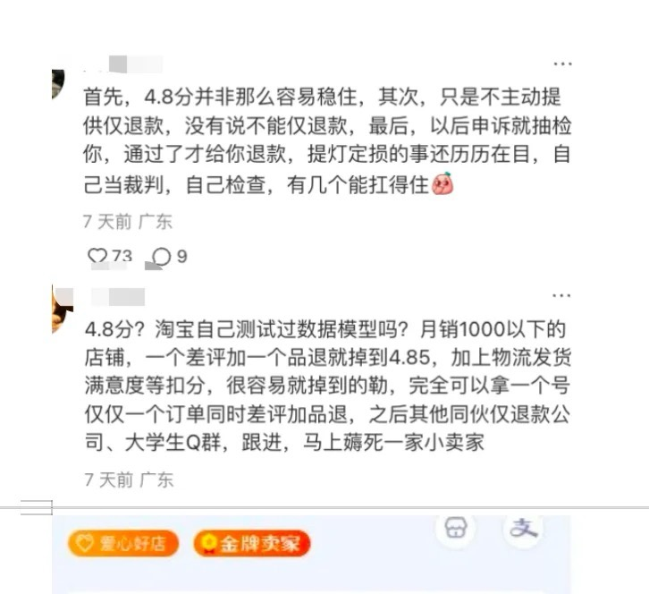 然而,4.8 分并不容易保持。有商家在社交平台公开表示:“4.8 分不是那么容易稳住的分数,月销 1000 以下的店铺,一个差评加一个品退就掉到 4.85,加上物流发货满意度等,很容易就掉到( 4.8 分以下)”。
