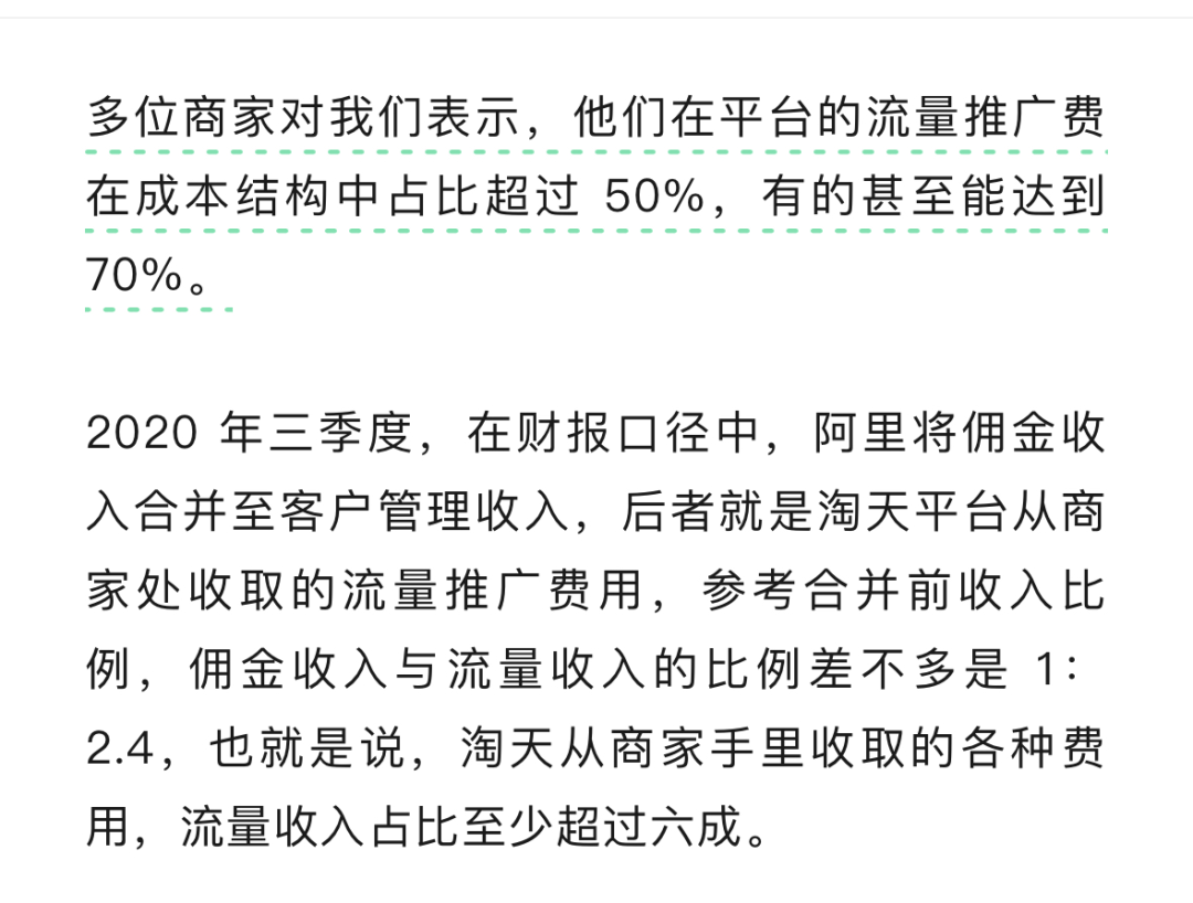 据新媒体“晚点 LatePost”报道,商家成本中的大头就是流量推广费用,有时可以达到 50%-70%。此外,淘天从商家端获取的费用,流量收入占比超过六成。