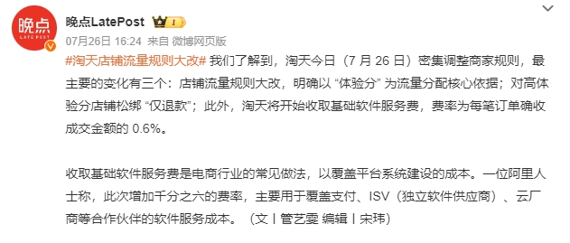 此外,淘天还宣布“平台交易相关卖家基础软件服务费收费,费率0.6%”、“取消天猫平台年度软件服务年费”,均于8月9日生效、9月1日正式实施。