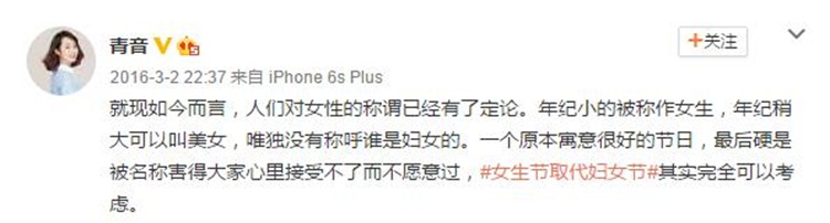 在范湉湉发出“女生节取代妇女节”的视频之后,不少公众人物表达了支持态度,资深情感节目主持人、CCTV特约心理专家青音便认为从节日名字考量的话,女生节更容易为人们所接受。“就现如今而言,人们对女性的称谓已经有了定论。年纪小的被称作女生,年纪稍大可以叫美女,唯独没有称呼谁是妇女的。一个原本寓意很好的节日,最后硬是被名称害得大家心里接受不了而不愿意过,‘女生节取代妇女节’其实完全可以考虑。”