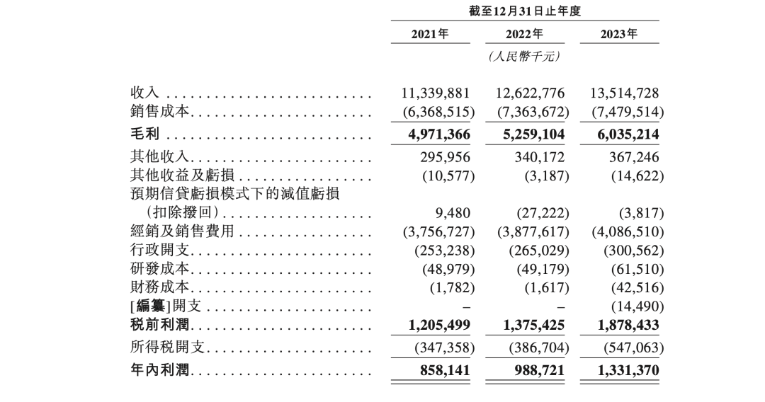 招股书显示,2021-2023年,华润饮料的收入分别约为113.40亿、126.23亿、135.15亿元;毛利分别约为49.71亿、52.59亿、60.35亿元;年内利润分别约为8.58亿、9.89亿、13.31亿元。