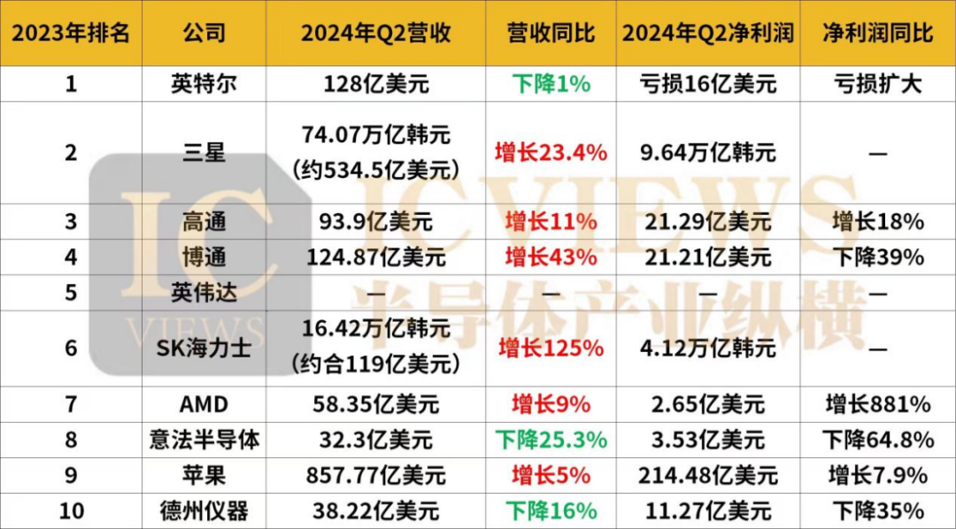 随着 2024 年中报的最新出炉,芯片大厂们的业绩成为市场瞩目的焦点。根据美国市场研究机构Gartner发布的2023年全球十大半导体公司榜单显示,排名前十的公司分别为:英特尔、三星、高通、博通、英伟达、SK海力士、AMD、意法半导体、苹果、德州仪器。