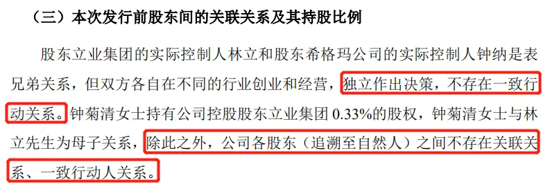 据招股书披露,立业集团的股东林立与钟菊清是母子关系,怡景食品的股东张则胜和张育民为兄弟关系,希格玛的股东钟纳和钟蔓为兄妹;林立和钟纳为表兄弟关系。除此之外,不存在关联关系和一致行动人关系。