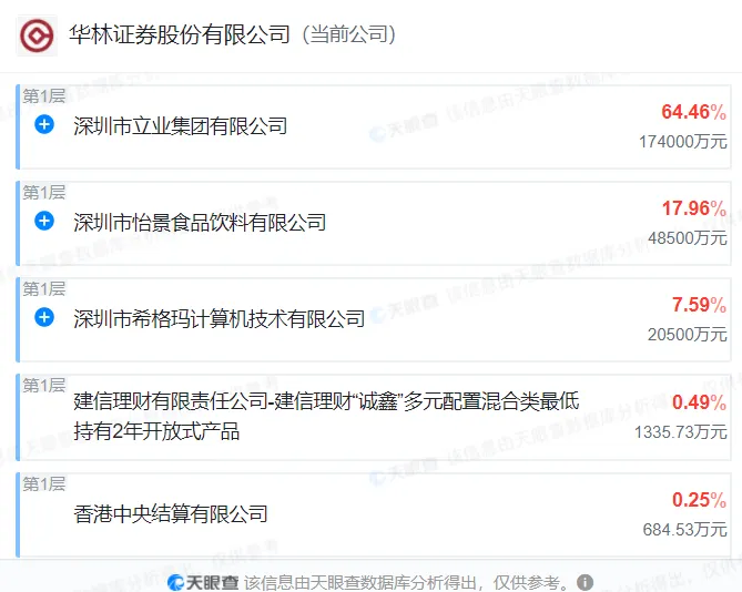 2013年,对部分股权清理之后,华林证券形成“三足鼎立”的局面——立业集团、怡景食品、希格玛分别持有华林证券71.62%、19.95%、8.43%的股份。