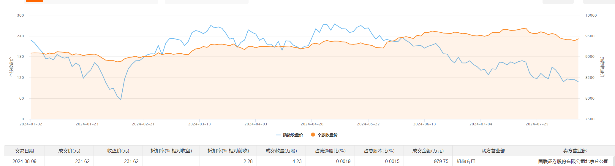 比亚迪8月9日大宗交易成交4.23万股,成交额979.75万元,占当日总成交额的0.35%,成交价231.62元,较市场收盘价231.62元持平。