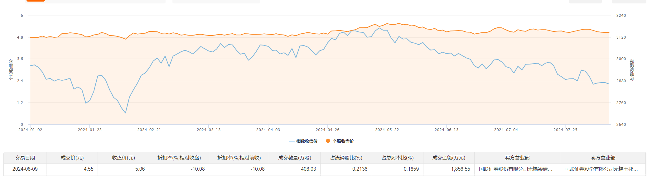 无锡银行8月9日大宗交易成交408.03万股,成交额1856.55万元,占当日总成交额的22.45%,成交价4.55元,较市场收盘价5.06元折价10.08%。