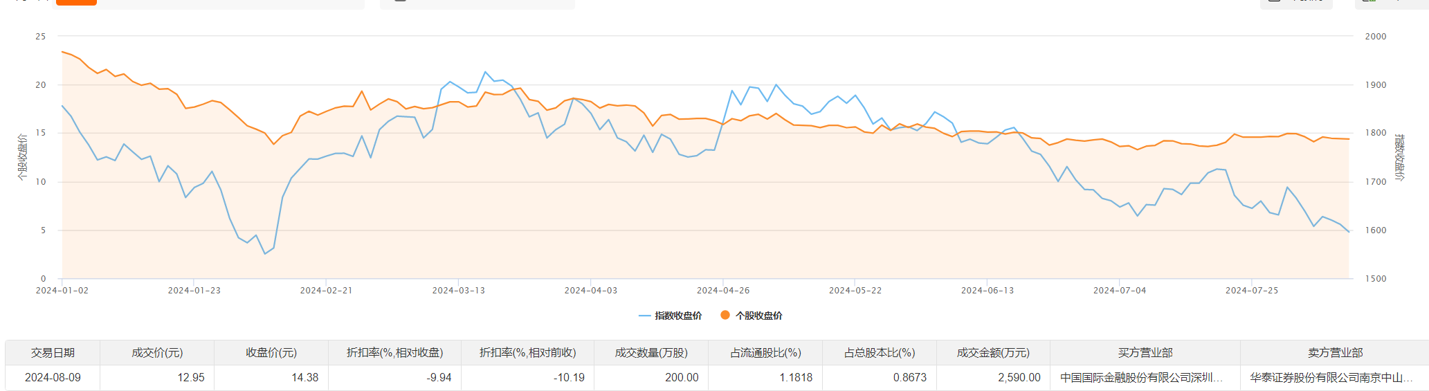 海晨股份8月9日大宗交易成交200万股,成交额2590万元,占当日总成交额的56.55%,成交价12.95元,较市场收盘价14.38元折价9.94%。