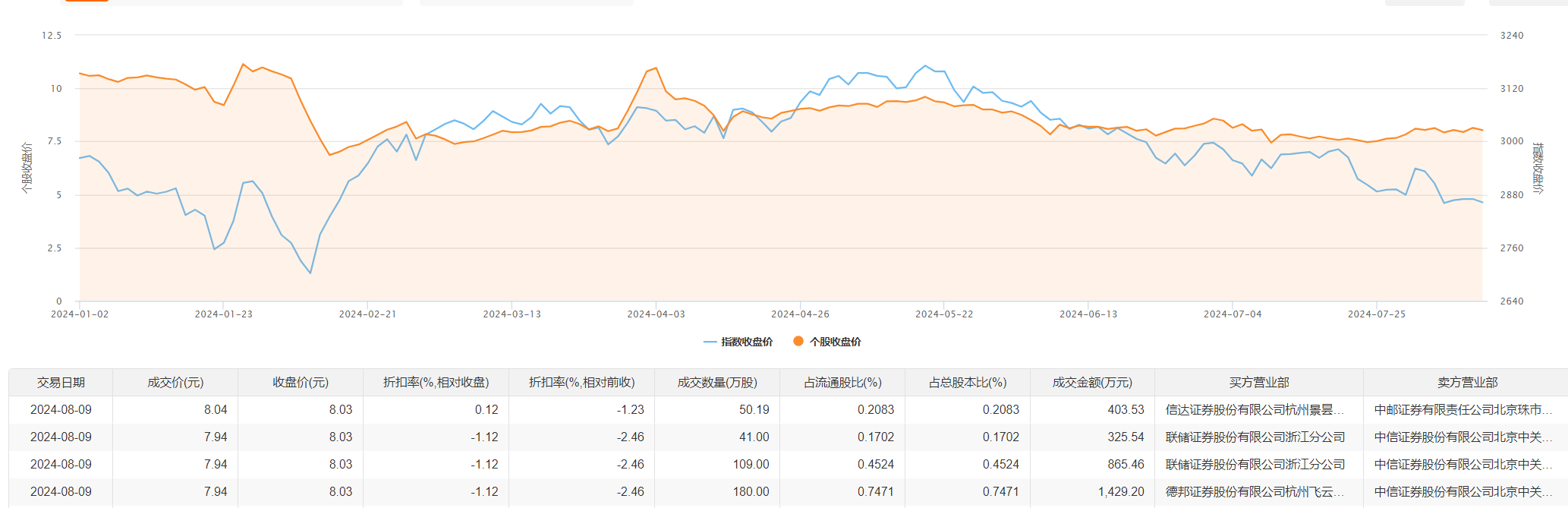 开创国际8月9日大宗交易成交380.19万股,成交额3023.73万元,占当日总成交额的61.11%,成交均价7.95元,较市场收盘价8.03元折价1.0%,其中最高成交价8.04元,最低成交价7.94元。