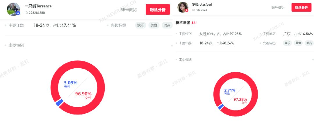 新榜数据显示,在分手事件发酵至今,王能能的抖音粉丝数量减少了近1.5万,小红书粉丝也流失了超过2000人。与此形成鲜明对比的是,罗拉的抖音账号粉丝数却增加了超过5万。这与《心动的信号2》中“天意CP”公开争执引发的效应类似。陈奕辰方泄露与张天的录音导致了女方粉丝数量增长超过十万,而男方粉丝数却呈现出相应的下滑。考虑到恋综网红的粉丝性别构成中,女性粉丝均占据了主导地位,因此在分手中更容易共情女方的心理和处境。