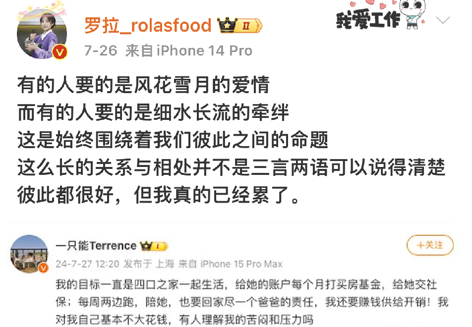 “巴拉拉能量”的风波,起源于罗拉发布的一条emo微博。她表示有的人要的是风花雪月的爱情,而有的人要的是细水长流的牵绊,直言“我真的已经累了”。言语间透露出自己渴望婚姻,而王能能只想停留在浪漫的恋爱阶段。有粉丝在评论区劝她何必在乎那一张纸,罗拉直白地回复道:“但生活不可能是我一直租房在这里等着他来恋爱,说的太轻松了”。