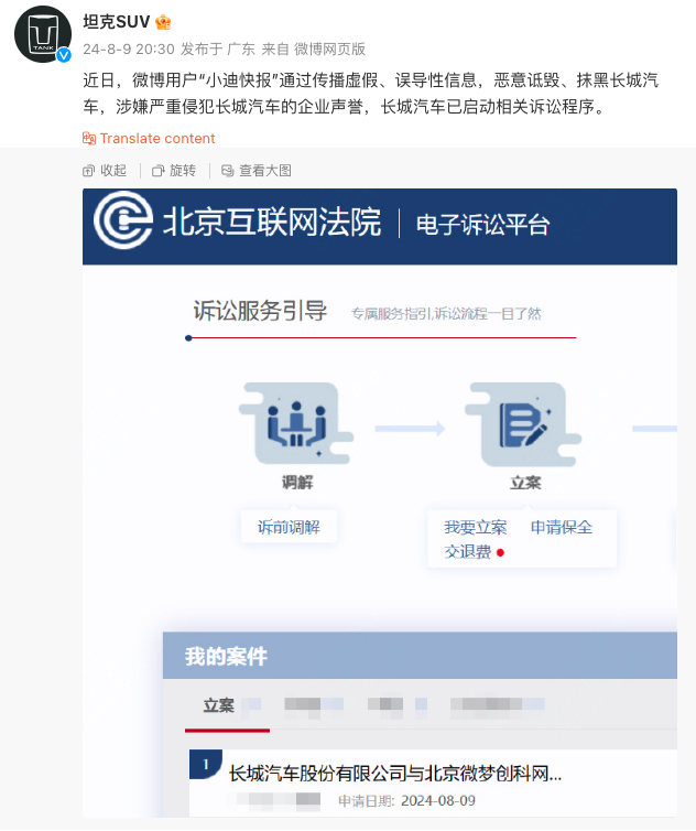 8月9日消息,长城汽车旗下坦克品牌官微发布声明称,“近日,微博用户‘小迪快报’通过传播虚假、误导性信息,恶意诋毁、抹黑长城汽车,涉嫌严重侵犯长城汽车的企业声誉,长城汽车已启动相关诉讼程序。”