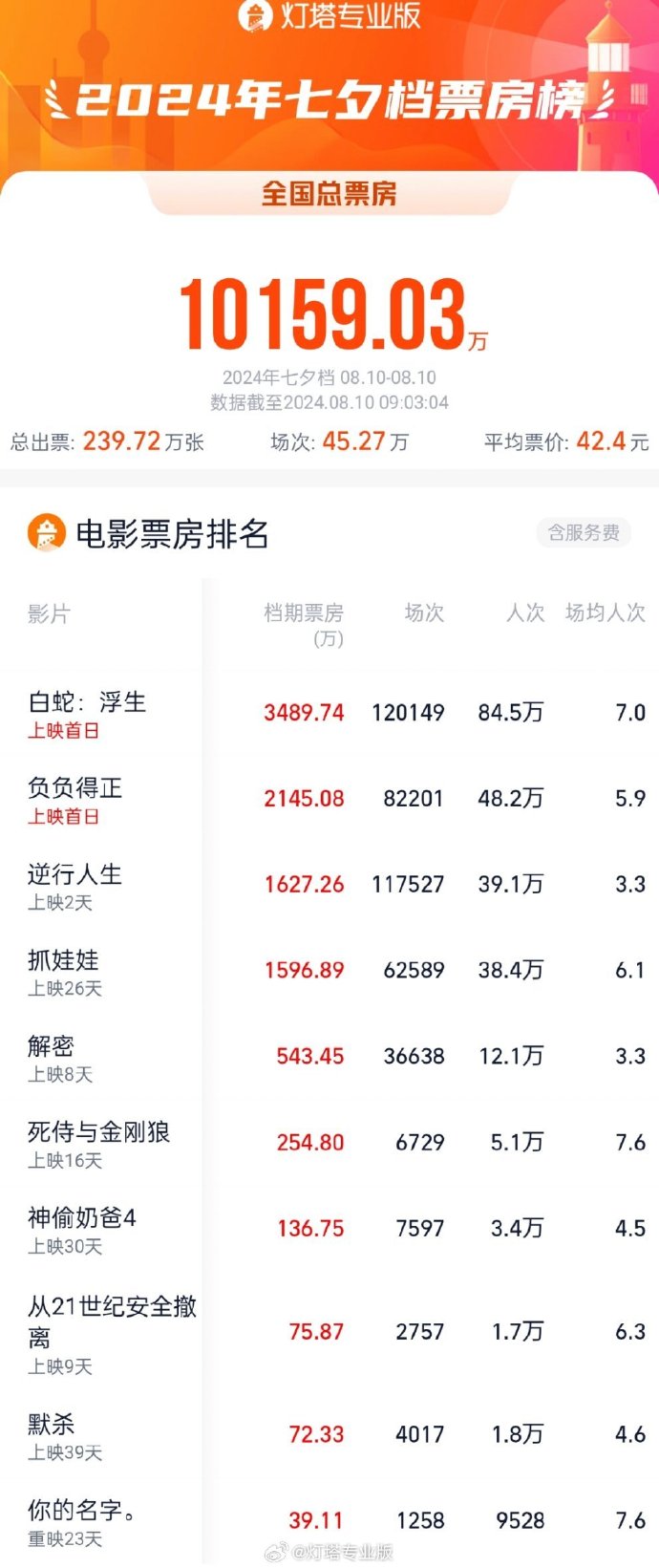 据灯塔专业版实时数据,截至9时3分,2024年七夕档(8月10日)总票房突破1亿,《白蛇:浮生》《负负得正》《逆行人生》暂列七夕档票房榜前三名。