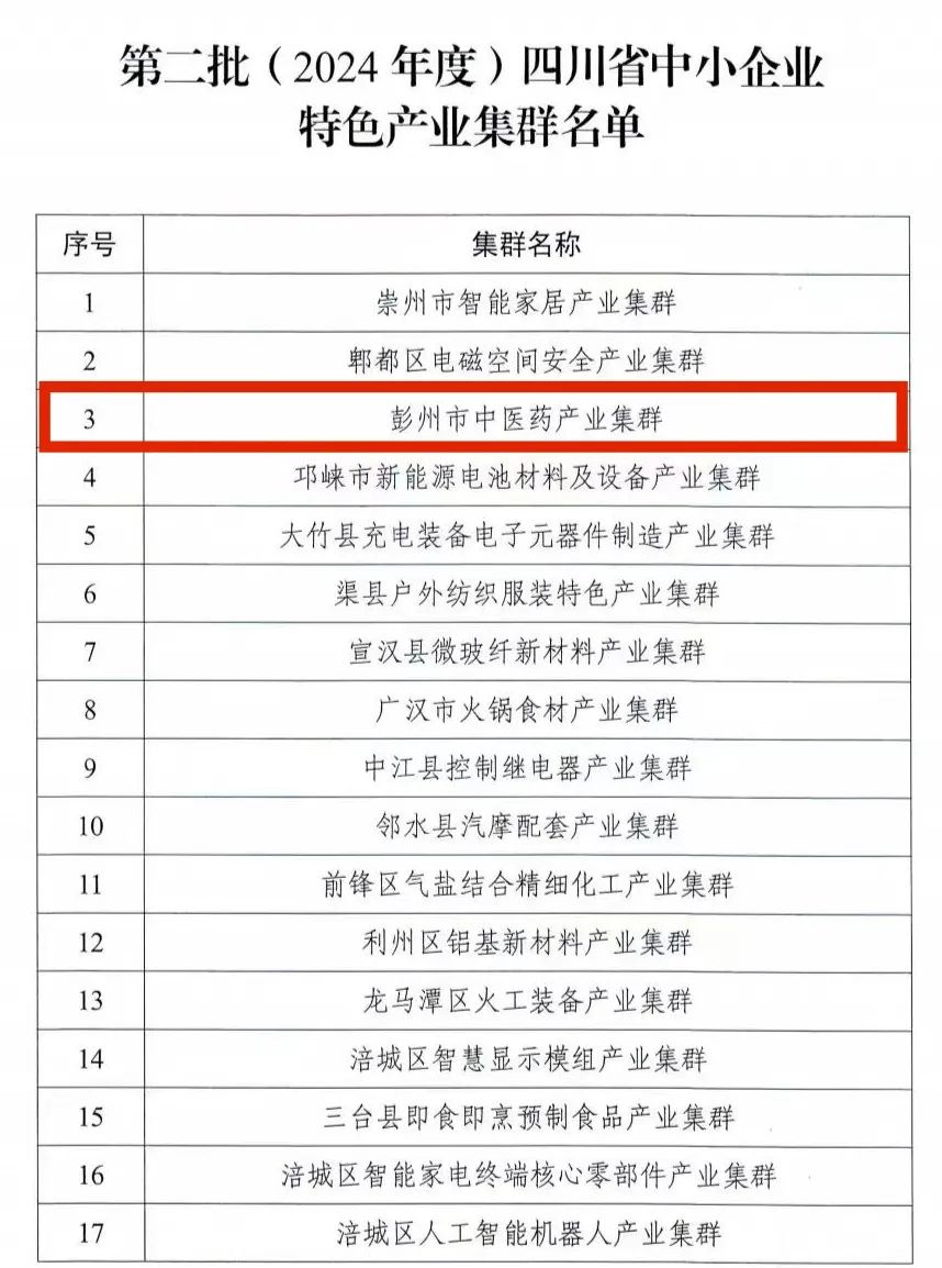 日前,四川省经济和信息化厅对2024年度四川省中小企业特色产业集群名单进行公示,全省共有36个产业集群入选。其中,彭州市中医药产业集群成功入围,这也是成都市4个入围集群之一。