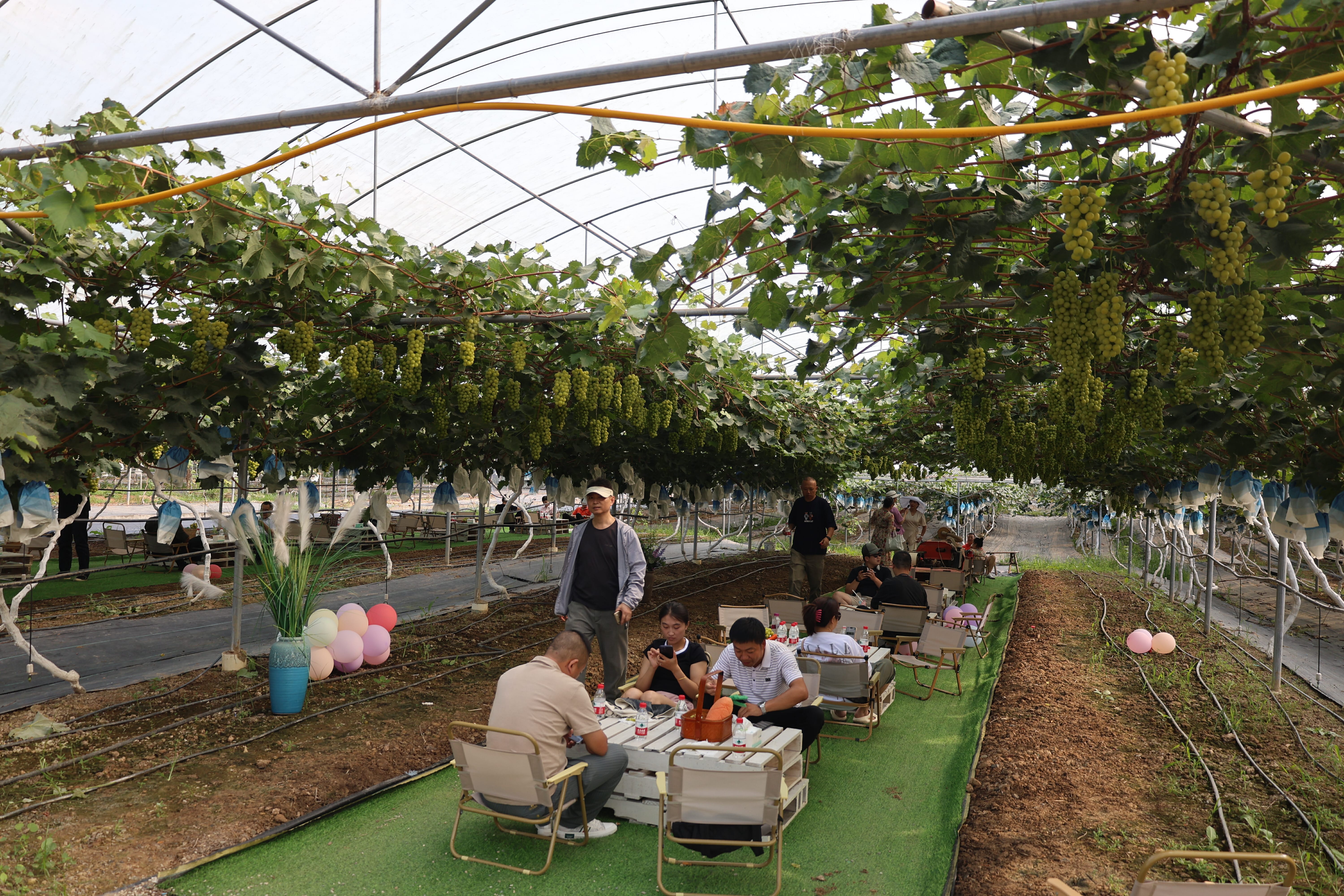 一架架郁郁葱葱的葡萄枝繁叶茂,一串串葡萄在阳光的照射下晶莹剔透。葡萄架下,白色的木桌,草垫、露营椅有序摆放,休闲的氛围感一下拉满。围桌而坐,游客和村民们品尝葡萄、休息聊天,也有的游客带上“摄影师”,在葡萄架下拍照留念,还有的,则在文创体验区感受柏合草编、漆扇、拓印等非遗的魅力,不亦乐乎。