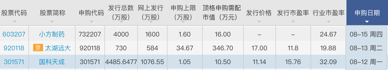 最后8月15日周四,投资者又可申购沪市的小方制药(603207.SH),其计划发行4000万股,网上发行数量为1600万股,申购上限1.6万股,顶格申购需配市值16万元,所处行业市盈率24.67倍。