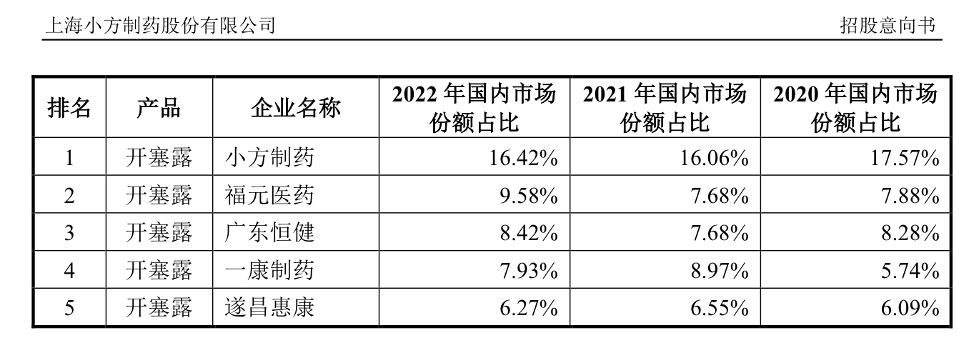 根据说明书,小方制药开塞露2022年的市场份额为16.42%,排在第一。不过公司也强调,根据福元医药2022年年度报告披露,其2022年开塞露出厂销售数量为5.41亿支,已超过小方制药开塞露出厂销售数量3.04亿支。