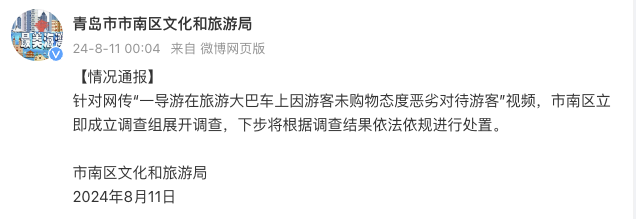 近日,网传视频显示,山东青岛一女导游因游客未购物发表有地域歧视侮辱游客的言论,还称“如果你穷,你在家里不要出来,出来就是你的错”,引发关注。8月11日,青岛市市南区文化和旅游局通报,针对网传“一导游在旅游大巴车上因游客未购物态度恶劣对待游客”视频,市南区立即成立调查组展开调查,下步将根据调查结果依法依规进行处置。