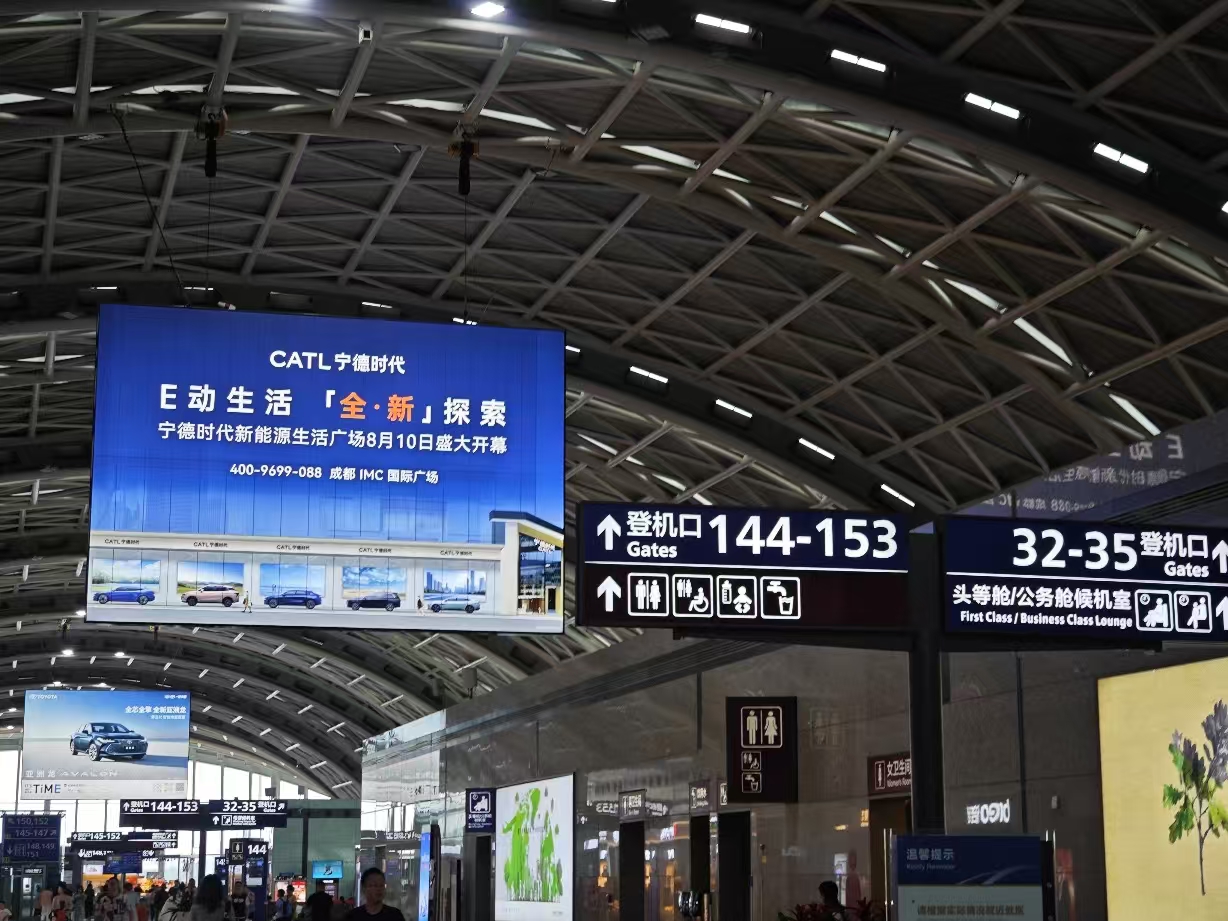 此次宁德时代新能源生活广场开幕日的当天下午,该新能源生活广场的巨幅广告便出现在了机场候机楼。