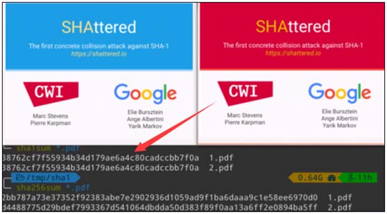 我们目前还未发现两个指纹相同的人,但理论上这种情况有可能出现,其概率大约为150亿分之一。而两个不同的文件,也有可能拥有相同的哈希值。谷歌恰恰是干了这样一件事,他们让两个内容不同的PDF文档用 SHA-1 演算后,得出完全一致的哈希值,就好像让两个高矮胖瘦截然不同也不是一个妈生的人拥有了相同的指纹。这种两个不同文档,哈希值却一致的情况被成为哈希碰撞(Hash Collision)。