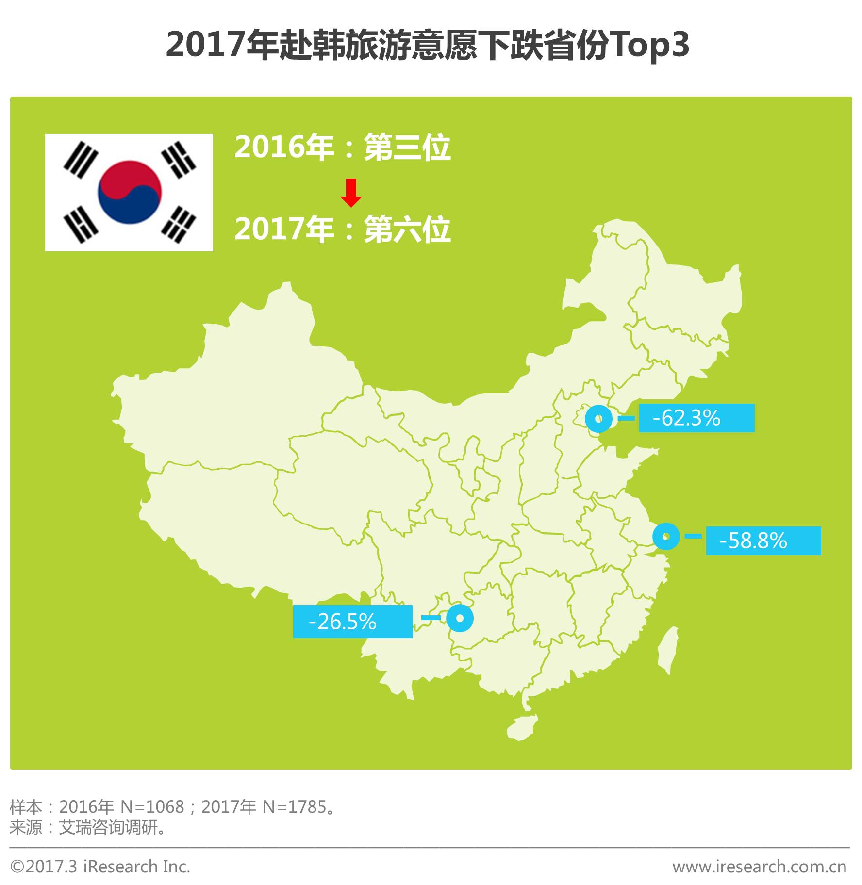 赴韩中国游客自2010年以来逐年增加,2016年首次超过800万人次,占赴韩外国游客的比例将近一半,同比增加34.4%(韩国文化体育观光部数据统计)。但根据艾瑞最新的调研数据显示,2017年游客出境游(含港澳台)热门目的地Top3分别是泰国、日本和香港,韩国跌至第六位,计划赴韩人数同比2016年下跌30%,尤其是上海地区民众赴韩意愿减弱,同比减少62.3%,其次是天津和重庆下跌明显。