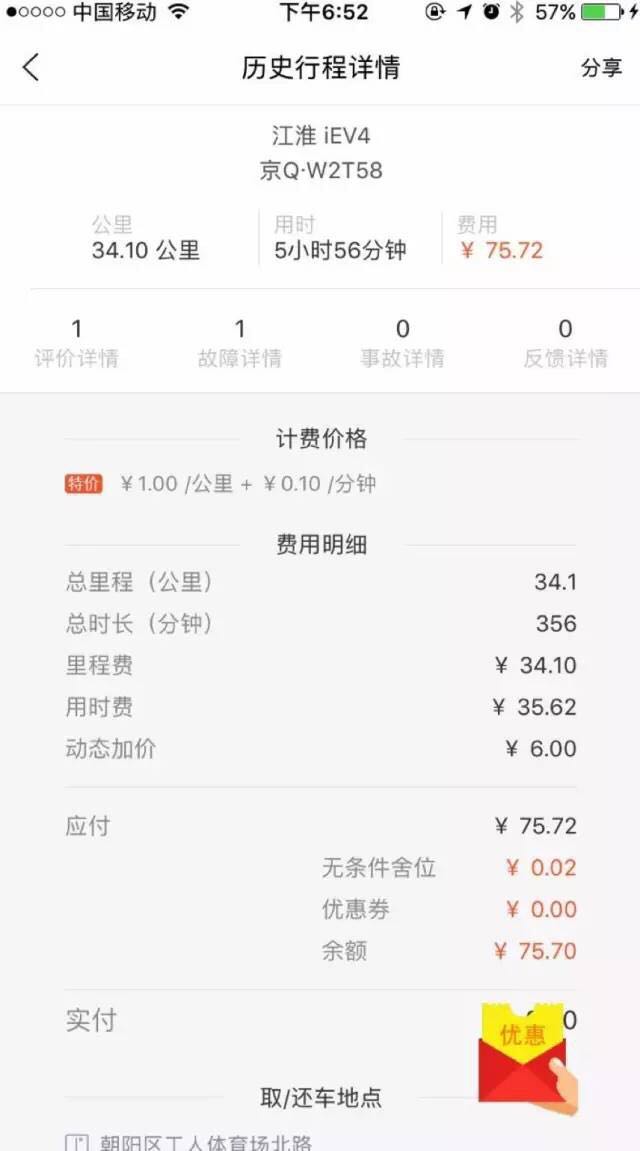(这里说明下,几乎所有的共享汽车要结束行程,必须使用 App。而一些共享电动汽车的平台,如果车不在指定的停车场,是无法结束行程的。)
