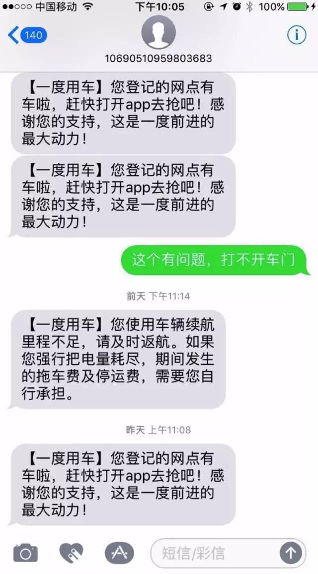 最令人无言的是,在 23 点 10 分,一度曾发来一条短信,当时,约莫是车突然减速前后几分钟。短信写着:「您使用车辆续航里程不足,请及时返航。如果您强行把电量耗尽,期间发生的拖车费及提车费,需要您自行承担。」