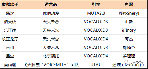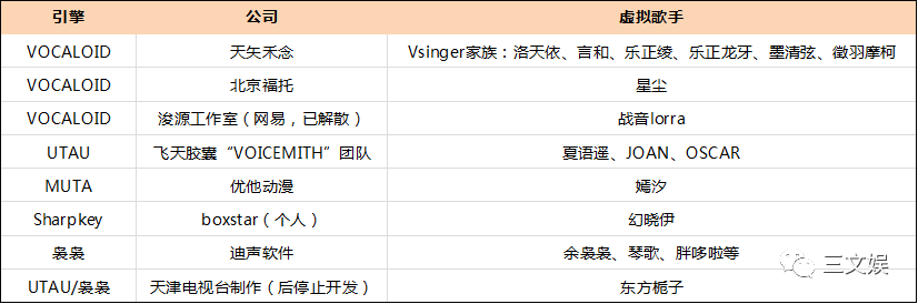 上图,三文娱整理了比较知名的十余位中文虚拟歌手以及其引擎和背后的公司