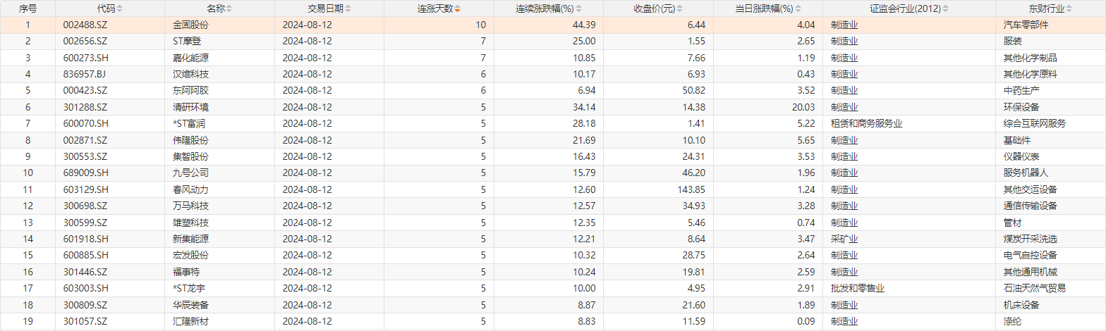 Choice数据统计,今日1只个股连续10天上涨,为金固股份;2只个股连续7天上涨,为ST摩登、嘉化能源;此外汉维科技、东阿阿胶2只个股连续6天上涨;清研环境、伟隆股份等连续5天上涨。