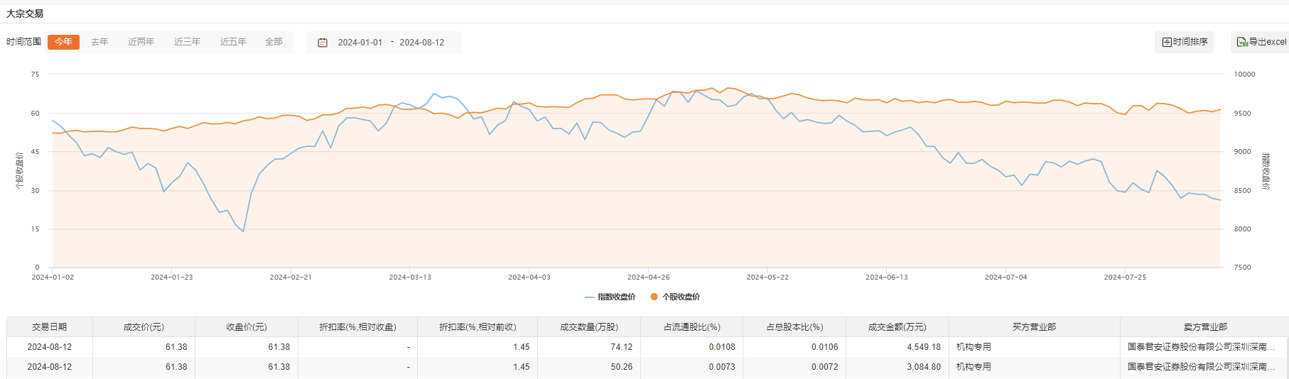 8月12日,美的集团现2笔共计7633万元平价大宗交易,买方均为机构席位,卖方均为国泰君安深圳深南大道京基一百证券营业部。